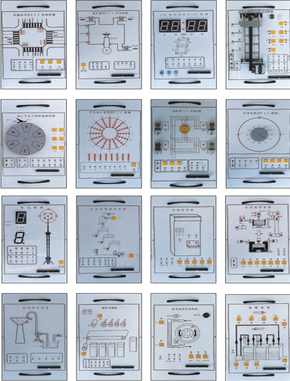 演示裝置上對PLC的輸入輸出均采用24V電源,5V電源供執行機構中的外圍使用,每套演示裝置主要由十七塊實(shí)驗掛箱組成,它們的型號分別為: