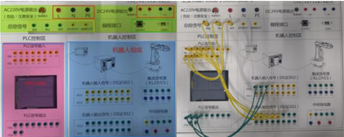 教學(xué)連線(xiàn)功能需根據每個(gè)模塊的配置進(jìn)行連接,由于模塊的各有不同所以接線(xiàn)方式有類(lèi)似也有不同的。在了解模塊特性并編寫(xiě)對應訓練程序后根據需要對PLC、機器人和模塊三部分之間進(jìn)行連接插線(xiàn)完成實(shí)驗任務(wù)。