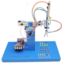 本實(shí)訓模型是一套完整的氣動(dòng)機械手搬運裝置,由安裝底板、氣動(dòng)手指、單桿提升氣缸、雙導桿伸縮氣缸、旋轉擺動(dòng)氣缸、多種類(lèi)型磁性傳感器、多種類(lèi)型電磁閥、空氣過(guò)濾器、氣源控制滑閥及接線(xiàn)端子排等組成。主要完成物料的搬運功能,氣動(dòng)機械手通過(guò)前臂下降,氣動(dòng)手指夾緊物體,手臂縮回,手臂右擺,手臂前伸,前臂下降,手爪松開(kāi)將物體放到指定位置等動(dòng)作后,機械手返回原位。將電磁閥及磁性開(kāi)關(guān)等元件的引出線(xiàn)連接到相應的端子接線(xiàn)排上,方便使用。能滿(mǎn)足職業(yè)院?删幊炭刂破、機電一體化、氣動(dòng)技術(shù)等相關(guān)課程的實(shí)訓教學(xué)?刂齐娫矗DC 24V