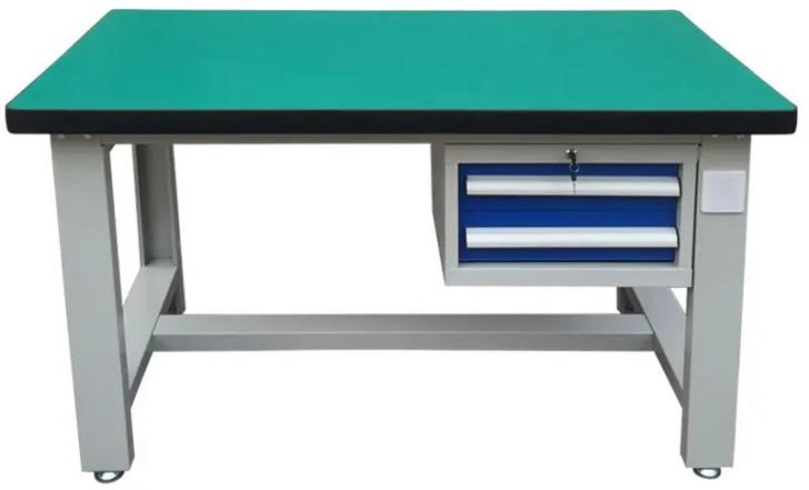 功能:由桌身、工具柜、臺面組成,用于電氣及機械結構的裝配平臺。 尺寸:不小于L1500mm×W700mm×H780mm 桌身:裝配桌預設電源插座擴展孔,依據用途可加裝電源插座。整個(gè)裝配桌可隨意拆裝,方便運輸安裝。 工具柜:采用冷軋鋼板折彎焊接而成,工具柜有多個(gè)抽屜,可儲藏工具,放置于裝配桌底部一側。 臺面:采用50mm厚高壓復合成型纖維板,表面覆蓋2mm綠色防靜電膠皮,四邊并以5mm ,PVC截面封邊,臺面具有耐磨、耐熱、耐污及易清潔等特點(diǎn)。具有耐沖擊、耐酸堿、吸震、防靜電的功能