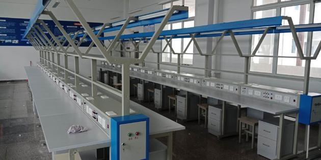 實(shí)訓臺上提供日光燈(用于照明)2個(gè),透明的PVC板4個(gè),可夾放原理圖等資料,另外還配備三芯雙聯(lián)暗插座4個(gè)、兩芯暗插座2個(gè)、工具柜2個(gè),工作臺面設有綠色防靜電桌墊,整個(gè)裝配線(xiàn)安全可靠。