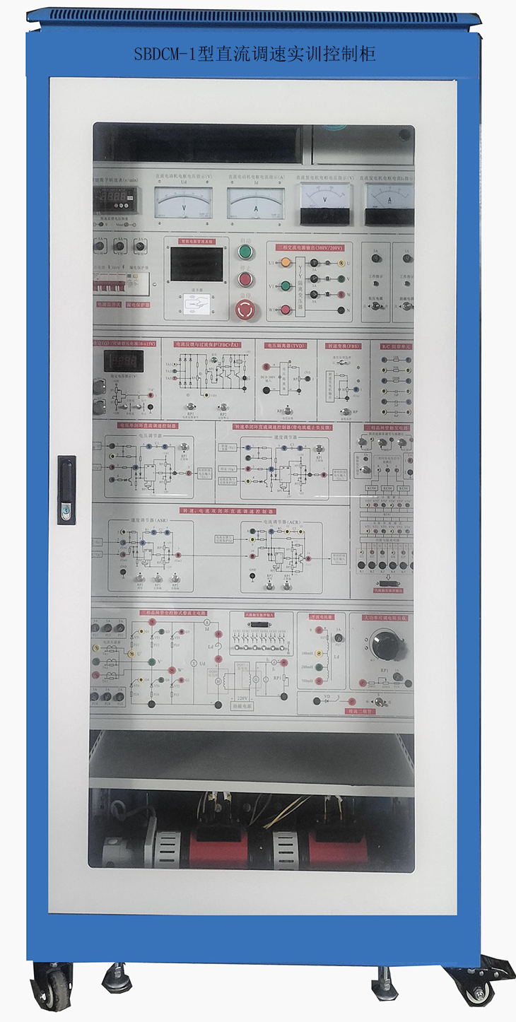 1.工業(yè)控制柜(設有玻璃門(mén)、直觀(guān)清晰)控制柜最上部為示波器放置區和設故箱,中間部分為電源控制部分,實(shí)訓接線(xiàn)區和相應的監控儀表,裝有±300V直流電壓表、±2.0A直流電流表和數字轉速表用于指示直流電機的運行狀態(tài),控制柜下部裝有三相同步變壓器、三相電流互感器和功率晶閘管模塊等。