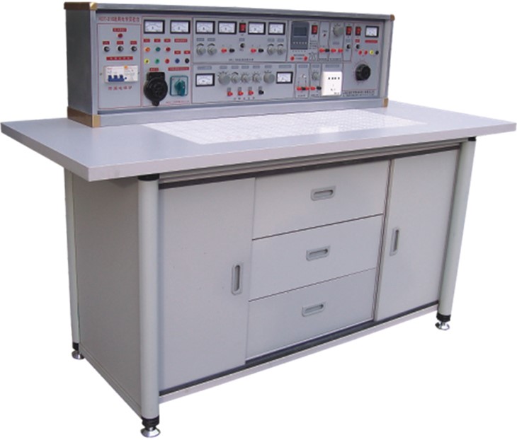 (一)實(shí)驗桌:學(xué)生實(shí)驗桌12張,一桌二座,實(shí)驗桌外形尺寸為160×70×80cm。桌子中央配置九孔電路插板,電路板注塑而成,表面布有九孔成一組相互聯(lián)通的插孔,元件盒在其上任意拼插成實(shí)驗電路。元件盒盒體透明直觀(guān),內裝電阻、電容、電感、二極管、三極管、場(chǎng)效應管、可控硅等元件來(lái)完成原理實(shí)驗。內裝元件一目了然,盒蓋印有永不褪色元件符號,線(xiàn)條清晰美觀(guān)。盒體與盒蓋采用較科學(xué)的壓卡式結構,維修、拆裝方便。實(shí)訓項目由二十幾套實(shí)訓電路板和相應元器件來(lái)完成。每張操作桌配有一粒膠皮板,保護通用電路板和桌面(如需要在桌上放置電動(dòng)機,焊接等) 桌子下部是元器件儲存柜,放置實(shí)驗元件、器材、工具等。