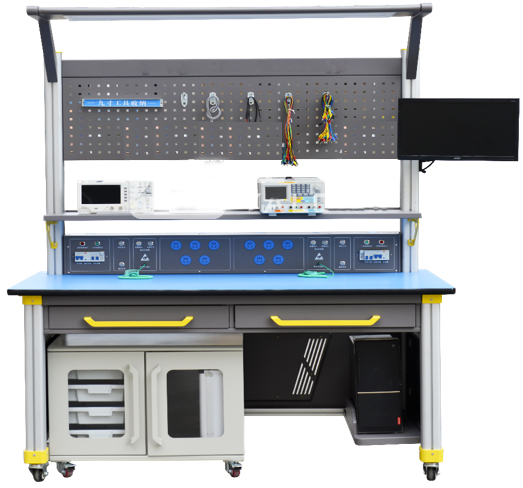 該設備主要由工作臺、實(shí)訓屏、實(shí)訓屏模塊、工具柜、電路實(shí)訓模塊