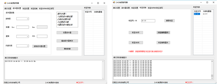 運行在windows系統中,通過(guò)串口與2.4G有源讀卡器通訊。 具有串口屬性配置、讀卡器設置(可設置波特率、信道、PID、功率)、標簽設置(標簽號設置、信道、PID)、標簽控制(控制標簽上的LED的開(kāi)啟或關(guān)閉)、2.4G有源標簽讀取、標簽塊區讀寫(xiě)等功能。 開(kāi)發(fā)環(huán)境:Visual Studio2010以上 語(yǔ)言:C# |