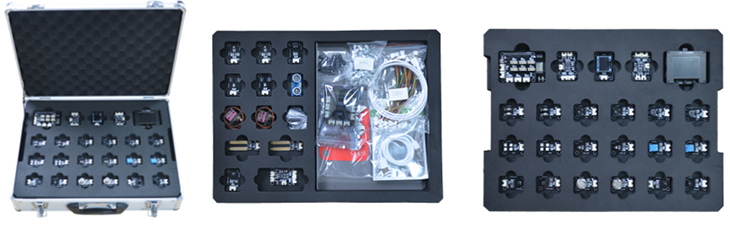 模塊包含LED燈模塊、按鍵模塊、RGB彩燈模塊、蜂鳴器模塊、人體感應傳感器、光敏傳感器、溫度傳感器、濕度傳感器、OLED顯示模塊、模擬量傳感器、直流電機模塊、氣壓傳感器模塊等十五余種模塊、傳感器通過(guò)4P連接線(xiàn)連接到通用擴展板。