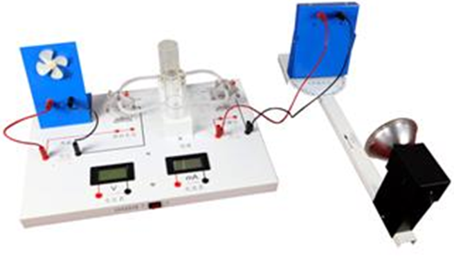 燃料電池教具是利用光線(xiàn)照射在太陽(yáng)能電池板上產(chǎn)生電能,然后利用產(chǎn)生的電能作用在電解電池模塊上,使水發(fā)生電解產(chǎn)生氫氣和氧氣。氫氣和氧氣進(jìn)入到發(fā)電模塊產(chǎn)生電能,帶動(dòng)風(fēng)扇轉動(dòng)。