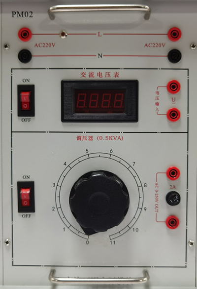 提供0~250V連續可調交流電源一路,數顯電壓變顯示輸出電壓值,輸出具有短路、過(guò)流保護等功能。提供交流電壓表一只,測量范圍0~500V,三位半顯示,能夠測量輸入交流電壓。