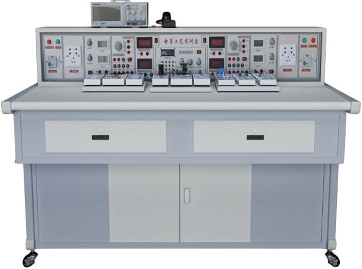 實(shí)訓桌為鐵質(zhì)雙層亞光密紋噴塑結構,桌面為防火、防水、耐磨高密度板,結構堅固。實(shí)訓桌下方設有柜子,可以放置實(shí)訓模塊和工具以及資料等,還設有四個(gè)帶剎車(chē)的輪子,便于移動(dòng)和固定。
