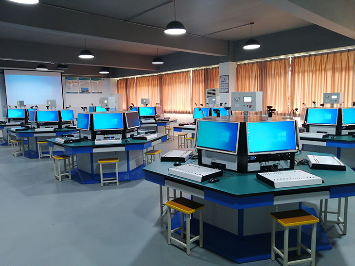 六邊形電源控制屏:電源控制屏采用六邊形結構,與工作臺相對應?蚣懿捎脙(yōu)質(zhì)鞍鋼盒裝鋼板,經(jīng)過(guò)機械加工成型,外表面噴涂彩色環(huán)氧聚塑。六個(gè)作業(yè)面配置有實(shí)訓電源及主機控制系統,控制面板具有漏電保護、短路保護功能。電源控制屏頂面采用10mm厚的鋁框包邊,內置有直徑為850mm的多角度公共操作平臺,公共操作平臺能360°旋轉,能做120°定位,平臺頂板采用10mm厚的鋁板加工成型,能載重約60Kg的典型工作任務(wù)。