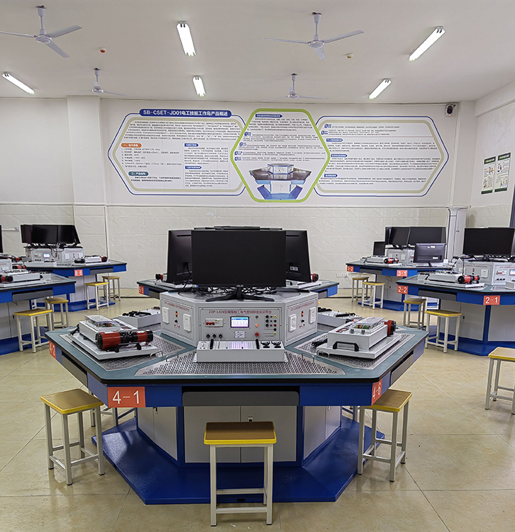 電工技能工作島由六邊形工作臺、六邊形電源控制屏及典型工作任務(wù)組成,能同時(shí)容納6名學(xué)生在設備上進(jìn)行操作。
