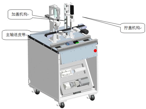 接收上一工作站填裝好顆粒的瓶子,當瓶子被輸送到加蓋機構后,主輸送皮帶停止,夾蓋定位夾緊機構將瓶子固定,加蓋機構啟動(dòng)加蓋流程,將蓋子加到瓶子上;加好蓋子后主輸送皮帶啟動(dòng),加上蓋子的瓶子繼續被送往擰蓋機構,到擰蓋機構下方,主輸送皮帶停止,擰蓋定位夾緊機構將瓶子固定,擰蓋機構啟動(dòng),將瓶蓋擰緊,主輸送皮帶啟動(dòng),將擰好蓋子的物料瓶輸送到下一工位。瓶蓋分為白色和黑色兩種。