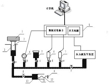 為了各壓力傳感器的靜態(tài)和動(dòng)態(tài)校準,系統采用自制的管路系統連接壓力波發(fā)生裝置,在管路上安裝工業(yè)用遠傳壓力表、動(dòng)態(tài)響應壓力傳感器等裝置。在進(jìn)行靜態(tài)校準時(shí),關(guān)閉截止閥f、c,打開(kāi)其余截止閥,通過(guò)砝碼來(lái)分別進(jìn)行工業(yè)用遠傳壓力表、動(dòng)態(tài)響應壓力傳感器的校準;在進(jìn)行動(dòng)態(tài)校準時(shí),關(guān)閉截止閥a、c,打開(kāi)其余截止閥,由壓力波發(fā)生裝置對管路系統產(chǎn)生交變的壓力信號。在進(jìn)行靜態(tài)和動(dòng)態(tài)校準時(shí),由安裝其上的工業(yè)用遠傳壓力表、動(dòng)態(tài)響應壓力傳感器等各種傳感器檢測檢測穩態(tài)或交變的壓力信號,并將信號轉換為標準工業(yè)信號或485信號傳遞給數據采集板卡,計算機則實(shí)時(shí)采集板卡的各傳感器轉換后的信號,并采用自主研發(fā)的上位機軟件對所采集的壓力信號進(jìn)行數據分析和處理,獲得各傳感器所采集的穩態(tài)和交變壓力,并實(shí)現對各壓力傳感器的靜態(tài)和動(dòng)態(tài)標定。