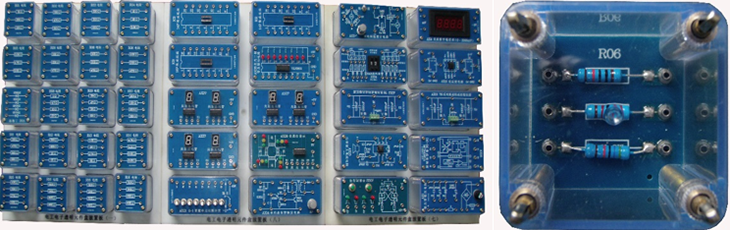 *9、透明電子技術(shù)模塊:由120個(gè)透明模組成,模塊塊使用透明的元件盒子,可以正反觀(guān)察電子元件組成,各個(gè)電子元件分別安裝在PCB板上,做實(shí)驗時(shí)可以用導線(xiàn)連接,可以學(xué)習電子電路基礎、數字電路技術(shù)、電力電子技術(shù),直流穩壓電源技術(shù)、電壓測量等家電電路上的常用控制電路。