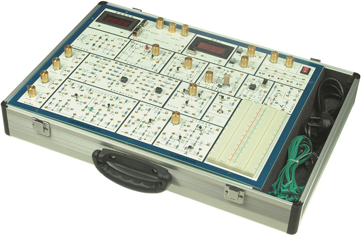 實(shí)驗箱中的實(shí)驗電路采用單元電路方式設計,單元電路即基本實(shí)驗電路,再外接其他元件為該電路參數,或與其他的單元電路組合,完成不同的實(shí)驗要求。每個(gè)實(shí)驗的電路原理圖都印刷在實(shí)驗板表面,學(xué)生可按照各個(gè)實(shí)驗的原理圖自已搭建電路, 既培養了學(xué)生的獨立思維能力及動(dòng)手能力,也增強了該實(shí)驗箱的適用性、擴展性。大部分元器件安裝在實(shí)驗板正面,增加了學(xué)生的感性認識;采用鎖緊式鍍金插孔將實(shí)驗連線(xiàn)引出,連接可靠,維修方便、簡(jiǎn)捷;實(shí)驗箱由一體型鉛合金型材制成, 箱體牢固可靠,不變形,重量輕,絕緣安全性能好,開(kāi)關(guān)箱蓋方便可靠,外型美觀(guān),造型氣派。