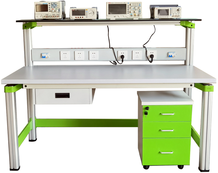 實(shí)驗桌規格為1500mm(長(cháng))*700mm(寬)*1150mm(高),設有一個(gè)抽屜。實(shí)驗桌主體結構全部采用高性能表面氧化的鋁型材及一次成型鋁壓鑄框架連接構件,連接構件采用壓鑄成型工藝(非焊接工藝),經(jīng)機加工、拋丸、噴砂,表面靜電噴涂工藝,安裝方便、快捷,用戶(hù)可自行DIY組裝。桌體立柱采用工業(yè)鋁型材成型工藝,表面氧化處理,截面尺寸:70mm×70mm,四面帶槽,槽寬約8mm,端部裝有注塑成型配套塑料堵頭。桌面采用25mmE1級三聚氰胺飾面板,桌面板下設支撐框架,承受力不少于300kg。配備儲存柜,存放元件及工具,儲存柜底部4只高強度萬(wàn)向可制動(dòng)PU腳輪,方便移動(dòng)。實(shí)訓裝置整體簡(jiǎn)約不簡(jiǎn)單,高端大氣,符合現代化產(chǎn)品審美和發(fā)展趨勢。