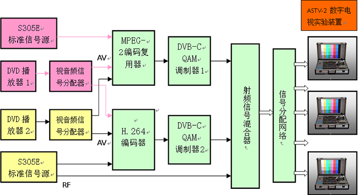 數字電視實(shí)驗系統由ASTV-2數字電視實(shí)驗裝置、圖像和聲音源(DVD播放器和AS305E彩色電視信號發(fā)生器)、MPEG-2和H.264數字電視編碼復用器、DVB-C/ QAM數字電視調制器、射頻信號混合器、信號分配網(wǎng)絡(luò )組成。DVD播放器和AS305E彩色電視信號發(fā)生器為系統提供多個(gè)圖像和聲音源,數字電視編碼復用器則將多個(gè)模擬圖像和聲音源數字化,按照MPEG-2或H.264的標準格式編碼、打包、復用形成一個(gè)傳送碼流(TS);傳送碼流送往DVB-C/ QAM數字電視調制器,調制到射頻信號上;不同頻率的數字、模擬射頻信號通過(guò)射頻信號混合器混合成一路信號,最后經(jīng)分配網(wǎng)絡(luò )送到各ASTV-2數字電視實(shí)驗裝置。
