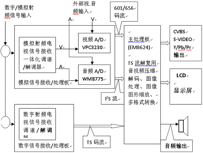 它由模擬電視信號接收通道、數字電視信號接收通道、信號主處理板及LCD顯示屏四大部分組成。