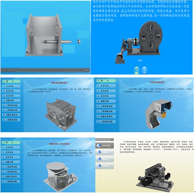 可實(shí)現以下功能:鉗工裝配技術(shù)的基本知識及介紹,鉗工裝配技術(shù)主要組成器件的結構及工作原理,變速箱的虛擬拆裝、三維動(dòng)畫(huà)視頻講解演示,離合器蝸桿傳動(dòng)機構的虛擬拆裝、三維動(dòng)畫(huà)視頻講解演示,齒輪減速器的虛擬拆裝、三維動(dòng)畫(huà)視頻講解演示,間歇回轉工作臺的虛擬拆裝、三維動(dòng)畫(huà)視頻講解演示,沖床機構的虛擬拆裝、三維動(dòng)畫(huà)視頻講解演示,動(dòng)力源的虛擬拆裝、三維動(dòng)畫(huà)視頻講解演示,送料機構的虛擬拆裝、三維動(dòng)畫(huà)視頻講解演示。