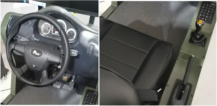 2)開(kāi)放式艙體,方向盤(pán)、變速機構、手制動(dòng)、加油踏板、制動(dòng)踏板、離合器踏板等實(shí)裝主要操作部件均需要模擬,其外觀(guān)尺寸、部署相對位置、操作行程,以及操作力度感受與實(shí)際基本一致,操縱機件性能工作可靠、操作靈活、低噪音。