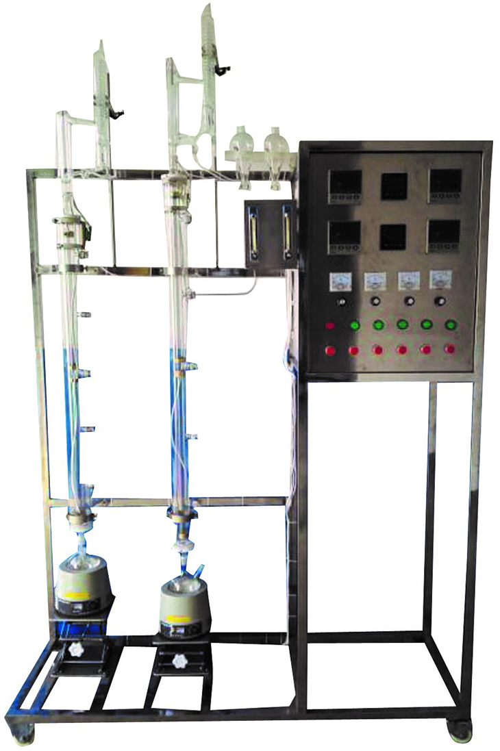 玻璃精餾塔、預熱器、電加熱器、流量計、溫度傳感器、溫度儀表、不銹鋼支架、不銹鋼控制柜。 |