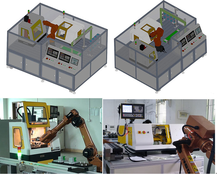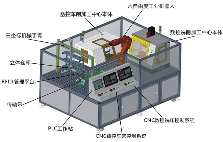 本套設備是以小型的柔性制造系統為載體,主要特點(diǎn)是占地空間小、操作安全、涉及的知識點(diǎn)豐富、綜合,系統性強、成本低、師生容易上手等;主要是由一臺工業(yè)6軸自由度機器人、一臺三坐標機械手臂、一臺柔性數控車(chē)床、一臺柔性數控銑床、RFID系統、PLC工作站、智能倉庫、中控臺、傳輸帶等部份組成,實(shí)現自動(dòng)化上下料、加工等無(wú)人工作環(huán)節,機器人按指令分別給兩臺機器送料取料;該系統能夠實(shí)現工業(yè)機器人上下料工作站系統的編程、上下料系統的集成、RFID系統應用、PLC系統編程、數控車(chē)床編程加工、數控銑床編程加工、現場(chǎng)總線(xiàn)的通訊實(shí)訓等環(huán)節。讓學(xué)生輕松掌握工業(yè)6軸機器人上下料與數控機床組建柔性加工生產(chǎn)系統,能滿(mǎn)足學(xué)生對工業(yè)機器人學(xué)習及操作的需要,學(xué)生通過(guò)該套系統的學(xué)習與訓練,對智能生產(chǎn)無(wú)人工廠(chǎng)的組建整體性應用有全面的了解與體驗。