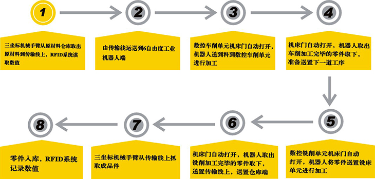 三坐標機械手臂從原材料倉庫取出原材料到傳輸線(xiàn)上,RFID系統讀取數值,由傳輸線(xiàn)運送到6自由度工業(yè)機器人端,由負責數控機床的上下料工作,數控車(chē)削單元將零件加工完畢后,機床自動(dòng)開(kāi)門(mén),零件由機器人送置到數控銑削加工中心進(jìn)行加工下一道工序,加工完畢后銑床自動(dòng)開(kāi)門(mén),由機器人取出成品零件送置到傳輸帶上,輸送到智能倉庫端,由三坐標機械手臂將成品零件入庫,RFID系統讀取數值。學(xué)生在熟練掌握該系統的操作與編程以后,也可以對零件類(lèi)型和加工工藝進(jìn)行調整。