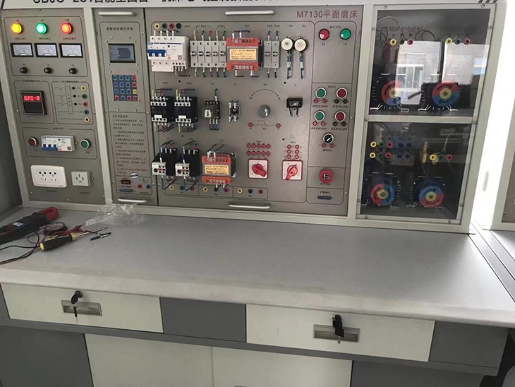 裝置主要有實(shí)訓屏、實(shí)訓機床電路掛箱、實(shí)訓桌等組成。