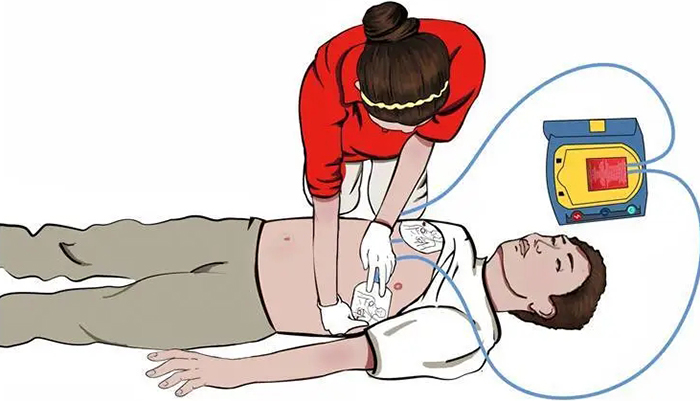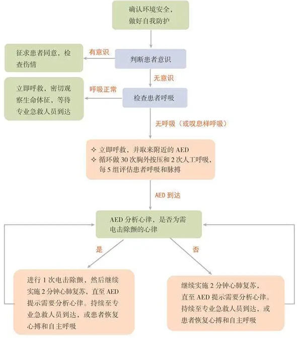 立即按照30:2的比例實(shí)施胸外按壓和人工呼吸,5 組(約2分鐘)后,AED再次自動(dòng)分析心律,遵循AED