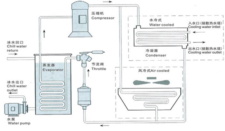風(fēng)冷式冷水機是將常溫的水通過(guò)冷水機制冷到一定的溫度以強化冷卻模具或機器,作為單機使用,散熱裝置為內置之風(fēng)扇,主要有三個(gè)相互聯(lián)系的系統:制冷劑循環(huán)系統、水循環(huán)系統、電器自控系統。