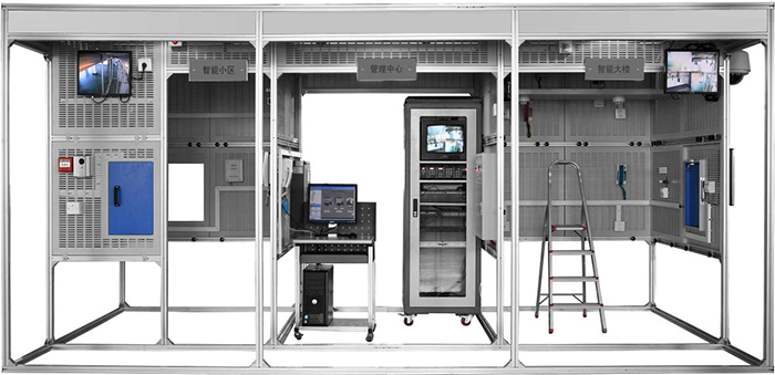 該系統在結構上以智能建筑模型為基礎,包含了智能大樓、智能小區、管理中心和樓道等典型結構,涵蓋了對講門(mén)禁、安防、視頻監控、消防、綜合布線(xiàn)和DDC監控照明六個(gè)系統,各系統既可獨立運行,也可實(shí)現聯(lián)動(dòng)。通過(guò)此系統進(jìn)行項目訓練,檢驗學(xué)生的團隊協(xié)作能力、計劃組織能力、樓宇設備安裝與調試能力、工程實(shí)施能力、職業(yè)素養和交流溝通能力等。
