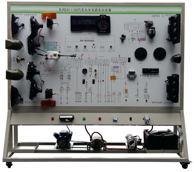 該設備采用全新EQ1118G整車(chē)電器實(shí)物為基礎,充分展示汽車(chē)儀表系統、燈光系統、雨刮系統、喇叭系統、發(fā)動(dòng)機電器系統、起動(dòng)系統和充電系統等汽車(chē)電器各系統的組成結構和工作過(guò)程。