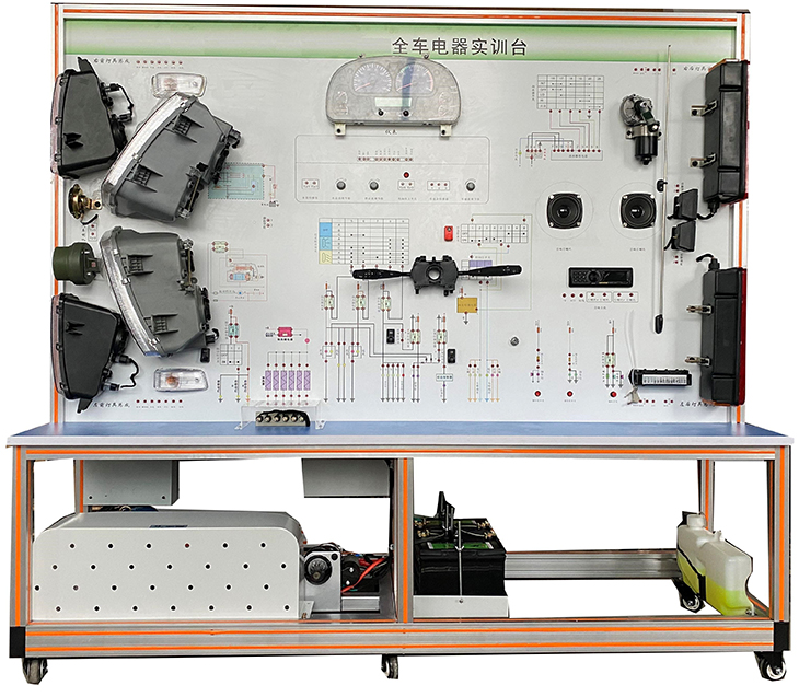 2.設備面板采用耐創(chuàng )擊、耐污染、防火、防潮的高級鋁塑板,表面經(jīng)特殊工藝噴涂底漆處理;面板打印有永不褪色的彩色電路圖;學(xué)員可直觀(guān)對照電路圖和實(shí)物,認識和分析汽車(chē)整車(chē)電器各系統的工作原理。