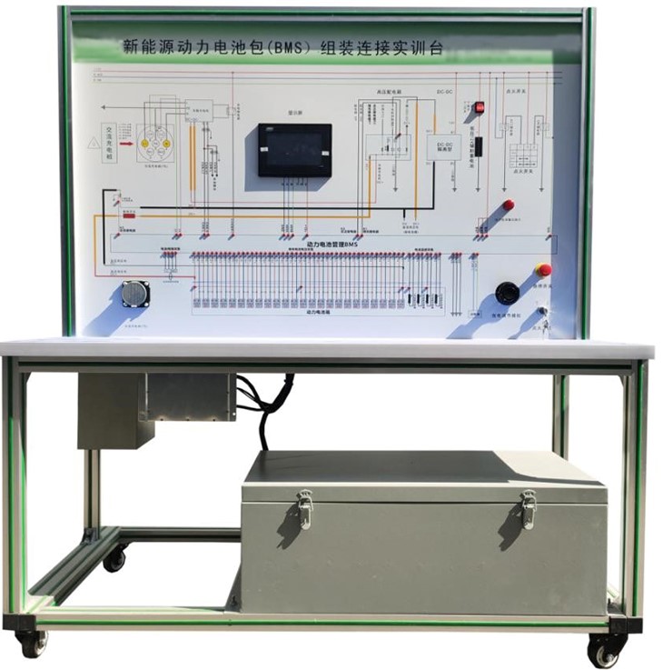 磷酸鐵鋰動(dòng)力電池包、實(shí)驗連接導線(xiàn)、BMS鋰電管理一體機、7寸動(dòng)力電池包觸摸顯示屏、車(chē)載充電機、國標充電插口、國標充電槍、緊急斷電開(kāi)關(guān)、霍爾電流傳感器、直流接觸器(包含充電繼電器、總正繼電器、總負繼電器、預充繼電器)、DC-DC轉換器、輔助蓄電池(12V45AH)、放電控制繼電器與放電負載、預充電阻、一體化全鋁合金型材搭建的移動(dòng)臺架(1500×700×1700mm 帶自鎖腳輪裝置,帶安裝檢測端子的原理面板,面板1448×940mm)、設備操作說(shuō)明書(shū)。
