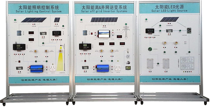 光伏發(fā)電系統集成演示版,主要由A、B、C三塊主模板組成。A 太陽(yáng)能照明控制系統演示模板、B 太陽(yáng)能離&并網(wǎng)逆變系統演示模板、C 太陽(yáng)能LED光源系統演示模板。