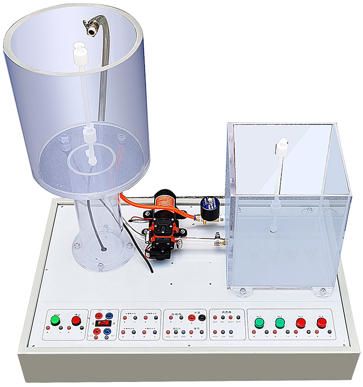 水泵由一功率放大電路來(lái)驅動(dòng),儲水箱中的水從有機玻璃水箱頂部進(jìn)入,底部用一手動(dòng)閥門(mén)控制出水的流量。用擴散硅壓力變送器來(lái)檢測液位,輸出4~20mA標準信號,通過(guò)PLC可編程控制器可實(shí)現液位的開(kāi)關(guān)和閉環(huán)控制,它可作為學(xué)校老師和科研技術(shù)人員作為研究PLC算法控制的一個(gè)實(shí)驗平臺。