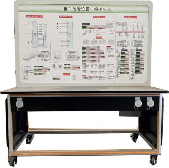 新能源整車(chē)故障設置與檢測連接平臺采用純電動(dòng)汽車(chē)原車(chē)插接器實(shí)物制作,包括電機控制MCU、電池電控BMS、VCU控制、車(chē)載充電系統、空調系統、轉向系統插接器及專(zhuān)用線(xiàn)束,通過(guò)專(zhuān)用線(xiàn)束與車(chē)輛連接,可直接在檢測臺面板上檢測系統電路元件的電信號,如電阻、電壓、電流、頻率信號等,可完成電動(dòng)汽車(chē)整車(chē)控制及驅動(dòng)傳動(dòng)系統(電機控制MCU、電池電控BMS、VCU控制、車(chē)載充電系統、空調系統、轉向系統)相關(guān)的實(shí)驗實(shí)訓內容。