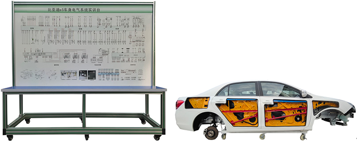 (比亞迪e5 EV450純電動(dòng)汽車(chē))車(chē)身電腦、手剎開(kāi)關(guān)、座椅、牌照燈、閱讀燈、帶移動(dòng)腳輪鋼制底座的汽車(chē)車(chē)殼總成(局部解剖)左前車(chē)窗電機、右前車(chē)窗電機、左后車(chē)窗電機、右后車(chē)窗電機、左前鎖塊、右前鎖塊、右后鎖塊、左后鎖塊、電源總開(kāi)關(guān)、保險絲盒、車(chē)窗組合開(kāi)關(guān)、中控鎖開(kāi)關(guān)、組合開(kāi)關(guān)、左右前大燈總成、左右前霧燈、左右轉向燈、左右組合尾燈、牌照燈、燈光開(kāi)關(guān)、倒車(chē)燈開(kāi)關(guān)、危險燈開(kāi)關(guān)、剎車(chē)開(kāi)關(guān)、雨刮總成、雨刮開(kāi)關(guān)、雨刮繼電器、洗滌電機、喇叭、喇叭開(kāi)關(guān)、電動(dòng)后視鏡與開(kāi)關(guān)、音響與導航總成、音響揚聲器(6寸200W)、DC12開(kāi)關(guān)電源、點(diǎn)火開(kāi)關(guān)、一體化全鋁合金型材搭建的移動(dòng)臺架(2040×650×1800mm (帶自鎖腳輪裝置,帶安裝檢測端子的原理面板,面板1988×1220mm)、故障設置和考核系統、設備操作說(shuō)明書(shū)。