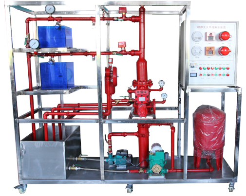 本系統全部元器件均采用標準工程件,整個(gè)實(shí)訓裝置主要由報警閥、蝶閥、排氣閥、水流、指示器、灑水噴頭、水箱、高位水箱、主泵、輔泵、控制電器、管路系統等組成。