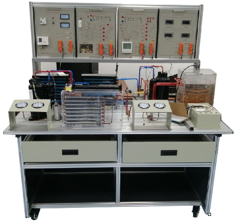 制冷熱泵與空調系統技能實(shí)訓設備該產(chǎn)品包含了制冷、熱力學(xué)、傳熱學(xué)和電氣控制等技術(shù),主要由熱泵型家用空調系統和空氣源熱泵系統兩大部分組成。在鋁合金導軌式實(shí)訓臺上安裝冷凝器、蒸發(fā)器、節流裝置、壓縮機、控制電路等,構成一個(gè)典型的制冷裝置,電氣控制采用掛箱式,能進(jìn)行制冷系統的組裝、調試、運行,真實(shí)呈現制冷裝置的工作過(guò)程,通過(guò)對制冷系統的安裝、保壓、檢漏、抽真空、電氣連線(xiàn)、加氟、系統調試及工況調整等,完成對學(xué)生的現代制冷與空調系統設備安裝、調試和維修技能訓練。