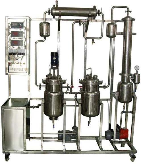 中藥提取實(shí)驗裝置由提取罐、蒸發(fā)器、攪拌電機、列管式加熱器、冷凝器、油分器、收油器、藥液泵、貯液罐、過(guò)濾器、真空泵、調速器、數顯溫度儀、不銹鋼框架、控制屏等組成。提取罐、蒸發(fā)器配導熱油加熱系統,提取罐、蒸發(fā)器頂部蒸汽出口均設置了除沫器。