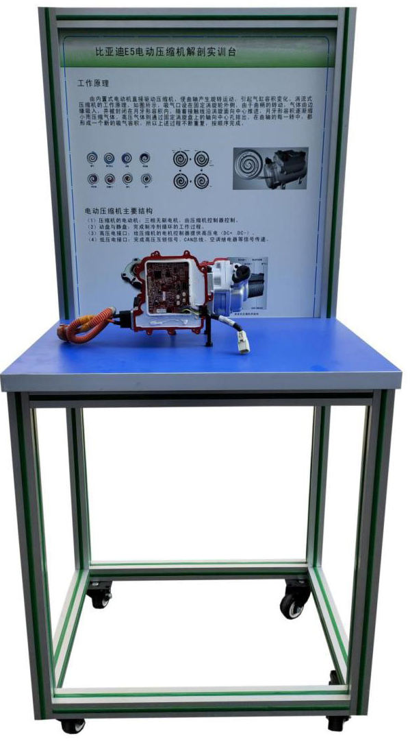 電動(dòng)壓縮機解剖平臺選用主流純電動(dòng)車(chē)配套電動(dòng)車(chē)壓縮機;通過(guò)解剖,展示現電動(dòng)車(chē)壓縮機內部結構和控制原理。