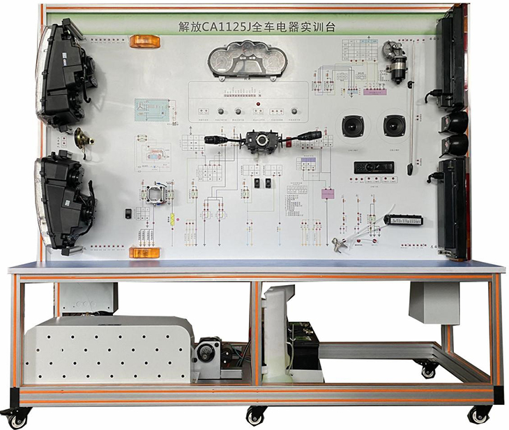 1、解放CA1125J全車(chē)電路實(shí)訓臺,解放1125JA 3E5全車(chē)電路實(shí)訓臺該設備采用全新解放CA1125J整車(chē)電器實(shí)物為基礎,充分展示汽車(chē)儀表系統、燈光系統、雨刮系統、喇叭系統、發(fā)動(dòng)機電控系統、起動(dòng)系統和充電系統等汽車(chē)電器各系統的組成結構和工作過(guò)程。