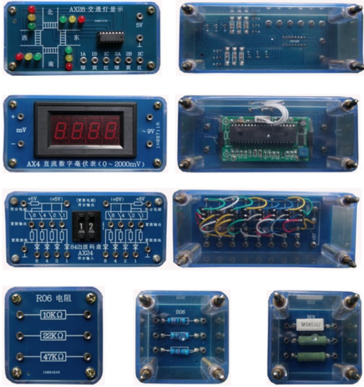 (透明電工電子元件模塊示例圖,共9塊板,140多只透明有機塑料封閉元件盒)