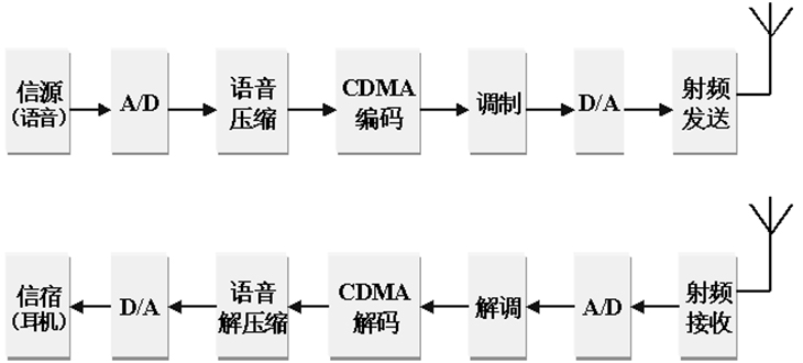 (1)發(fā)端:語(yǔ)音數字化、壓縮、CDMA編碼、調制、上變頻、發(fā)射……;