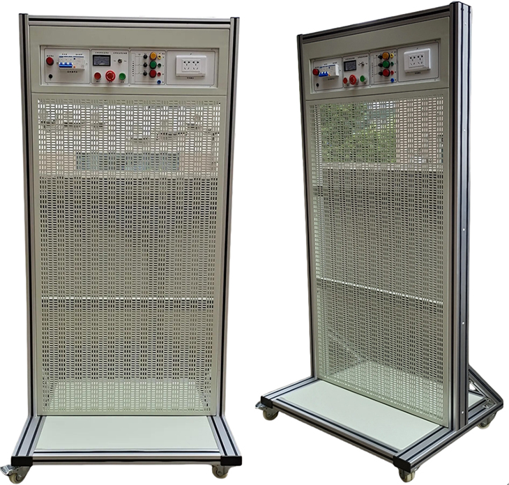 網(wǎng)孔板維修電工實(shí)訓平臺采用立式結構 開(kāi)放式設計,主體采用40*80鋁型材做骨架,周邊采用冷扎鋼板做封板板,表面靜電噴塑處理,整機既堅固耐用,又美觀(guān)大方。底部裝有帶腳墊萬(wàn)向輪,萬(wàn)向移動(dòng)時(shí)用,可調腳固定時(shí)用,移動(dòng)固定兩相宜。頂部安裝電源模塊,下部為實(shí)訓區域,依據任務(wù)安裝不同掛件。