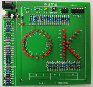 初級功能訓練板:主要是滿(mǎn)足插件元器件焊接的教學(xué)訓練。教學(xué)生認識插件電阻、插件二極管、插件無(wú)極性電容、電解電容圖標以及插件芯片等焊接。電阻選用1/8W,1/4W兩種常規格的設計焊盤(pán),并設計較疏、一般、較密三種焊盤(pán)間距。LED焊接采用3和?5兩種腳距形成'OK'字樣。初級功能訓練板焊接主要教會(huì )學(xué)生直插元器件認知、元器件整形、插件、焊接等技能。也可以教學(xué)生學(xué)習電阻色環(huán)標識。