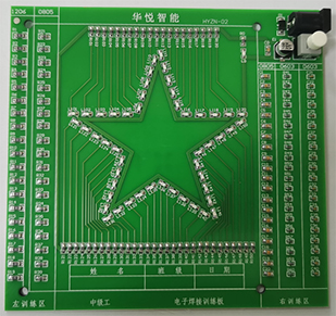 中級功能訓練板:主要為滿(mǎn)足貼片元件焊接的教學(xué)訓練。包括左右兩邊焊接技能訓練區和中間實(shí)戰區;居柧殔^設1206、0805、0603三種焊盤(pán)。實(shí)戰區設計為"五角星"樣式,直觀(guān)顯示焊接效果。中級功能訓練板焊接主要練習貼片元件拆卸、焊接技能。也可以學(xué)習0603電阻值查詢(xún)表。