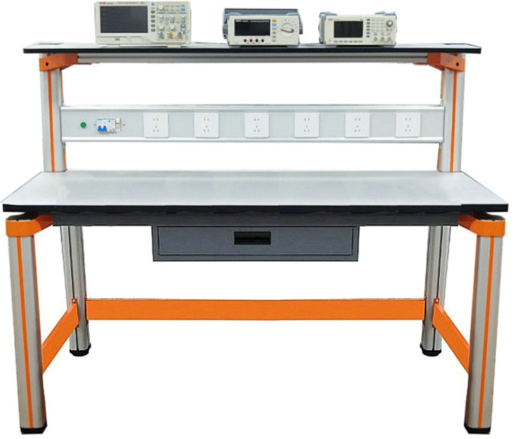 (三)實(shí)訓桌結構:實(shí)訓桌規格為1600(長(cháng))*700(寬)*1300(高),設有一個(gè)抽屜;實(shí)訓桌主體結構全部采用高性能表面氧化的鋁型材及一次成型鋁壓鑄框架連接構件,連接構件采用壓鑄成型工藝(非焊接工藝),經(jīng)機加工、拋丸、噴砂,表面靜電噴涂工藝,安裝方便、快捷,用戶(hù)可自行DIY組裝。桌體立柱采用工業(yè)鋁型材成型工藝,表面氧化處理,截面尺寸:70mm×70mm,四面帶槽,槽寬約8mm,端部裝有注塑成型配套塑料堵頭。桌面采用25mmE1級三聚氰胺飾面板,桌面板下設支撐框架,承受力不少于200kg。配備儲存柜,存放元件及工具,儲存柜底部4只高強度萬(wàn)向可制動(dòng)PU腳輪,方便移動(dòng)。實(shí)訓裝置整體簡(jiǎn)約不簡(jiǎn)單,高端大氣,符合現代化產(chǎn)品審美和發(fā)展趨勢。