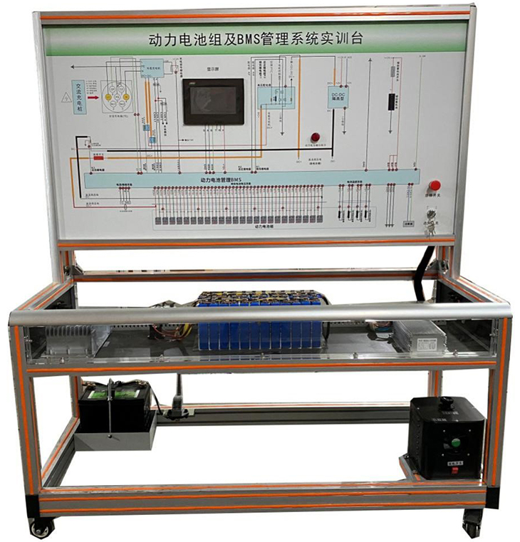 磷酸鐵鋰動(dòng)力電池包,BMS鋰電管理一體機,動(dòng)力電池包觸摸顯示屏,充電機,國標充電插口,國標充電槍?zhuān)o急斷電開(kāi)關(guān),霍爾電流傳感器,直流接觸器,DC-DC轉換器,輔助蓄電池,放電控制繼電器與放電負載,電阻,可移動(dòng)實(shí)訓臺(帶檢測端子的原理面板)。